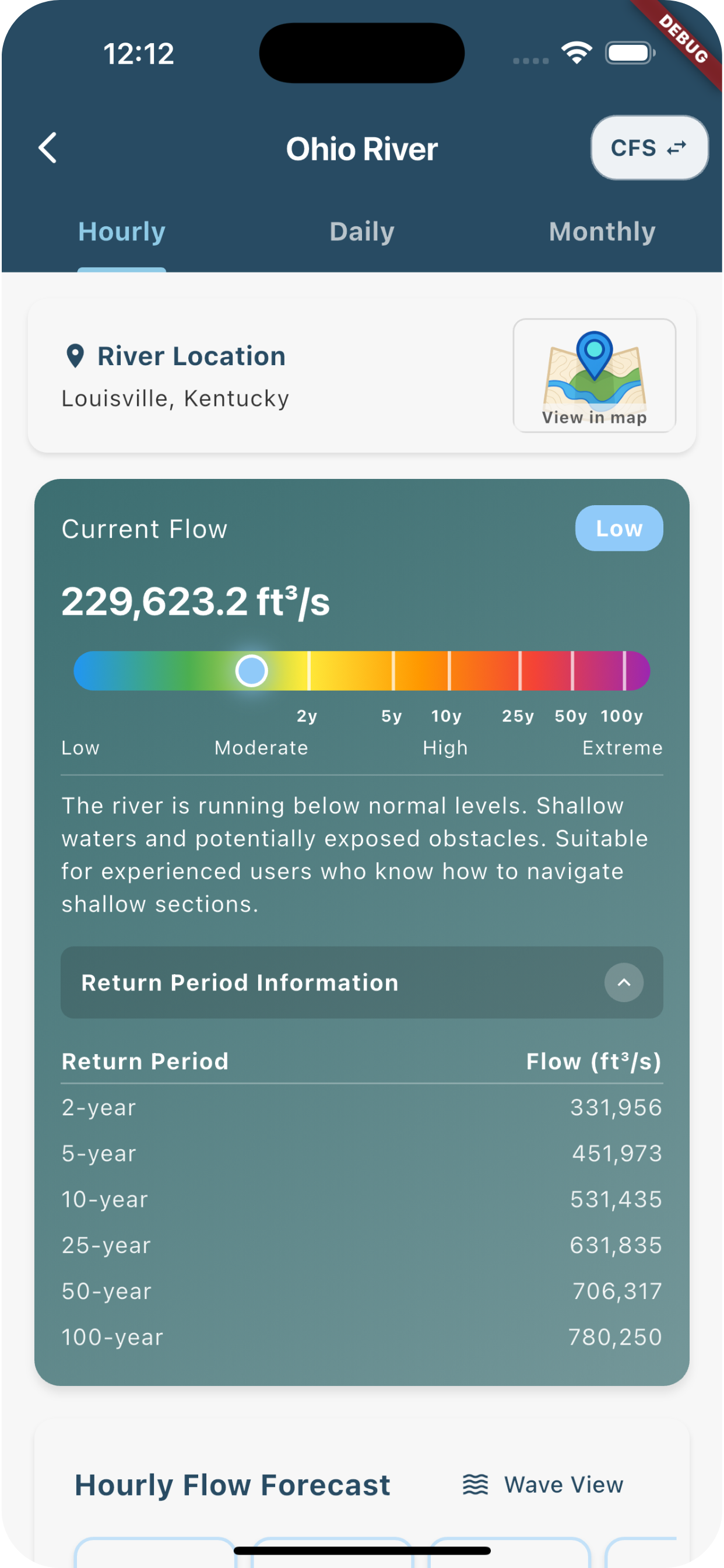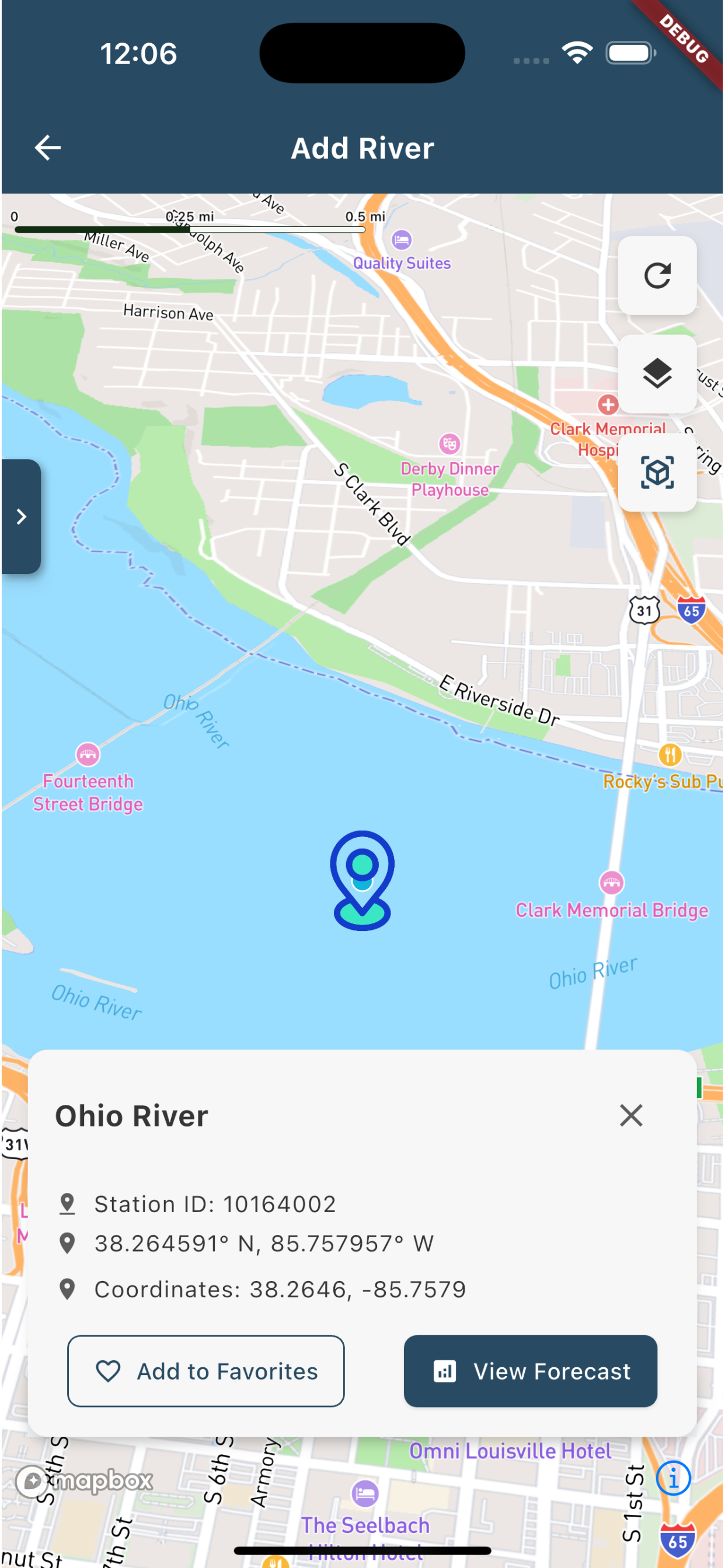 - The river's name and location (e.g., Louisville, Kentucky) will be displayed.