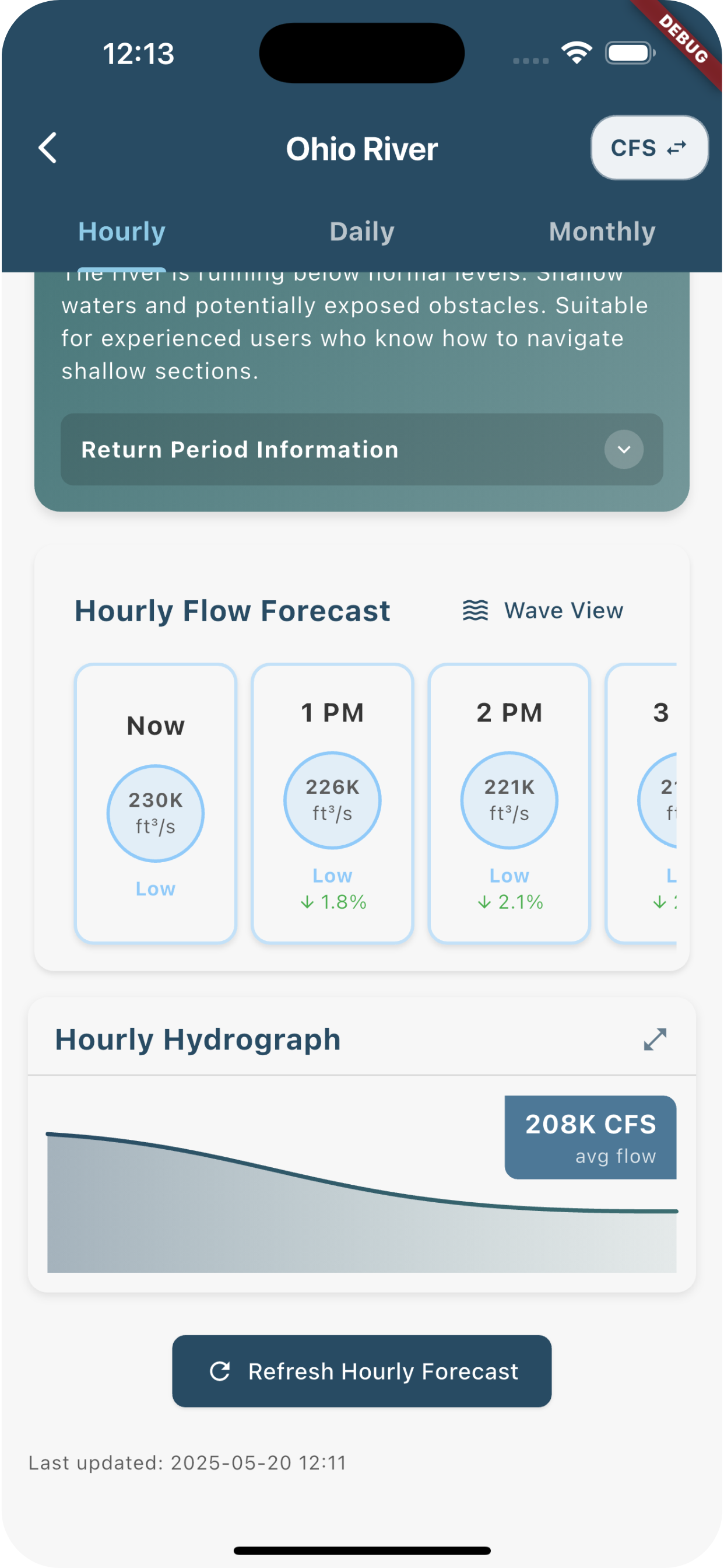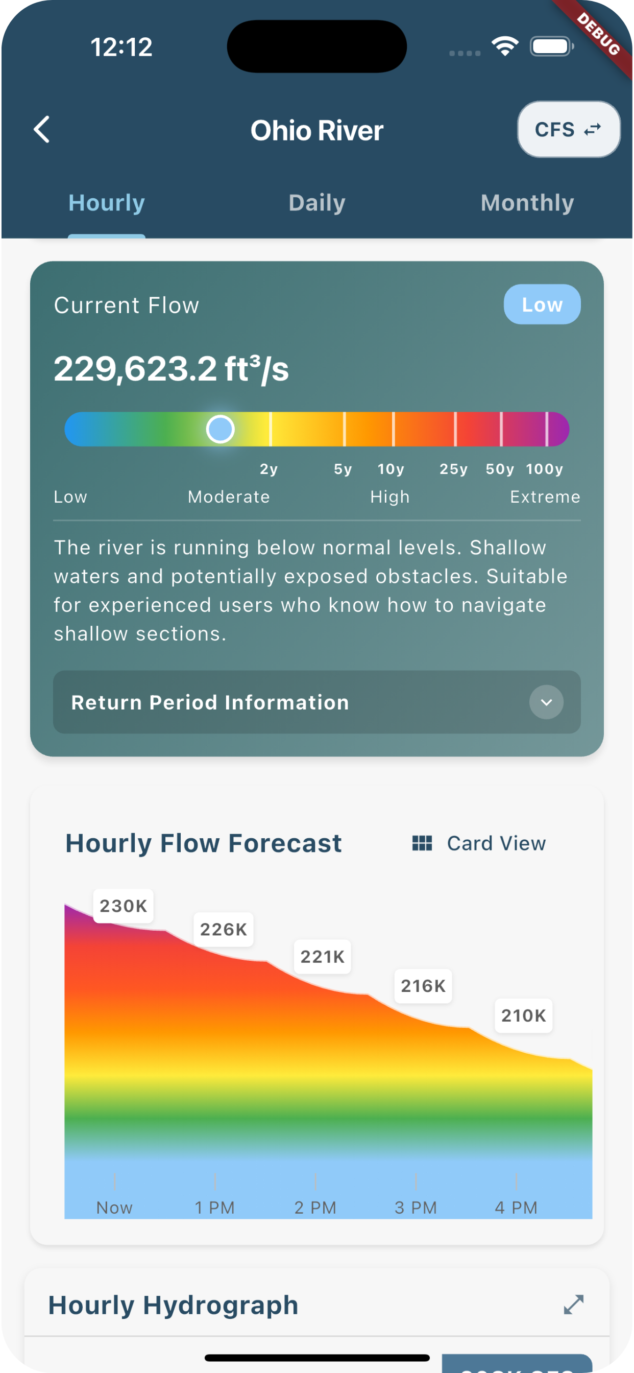 - See the hourly flow forecast in ft³/s for the next few hours.