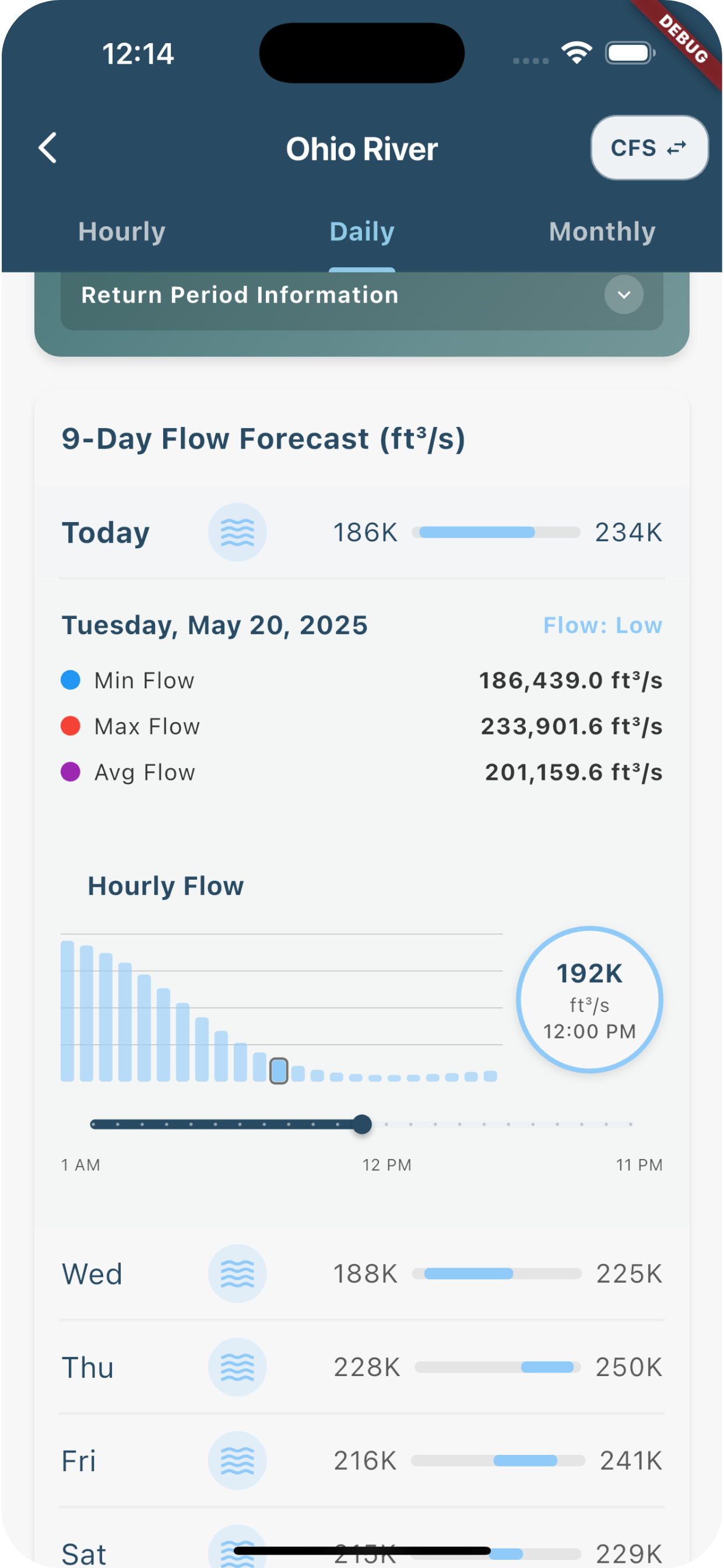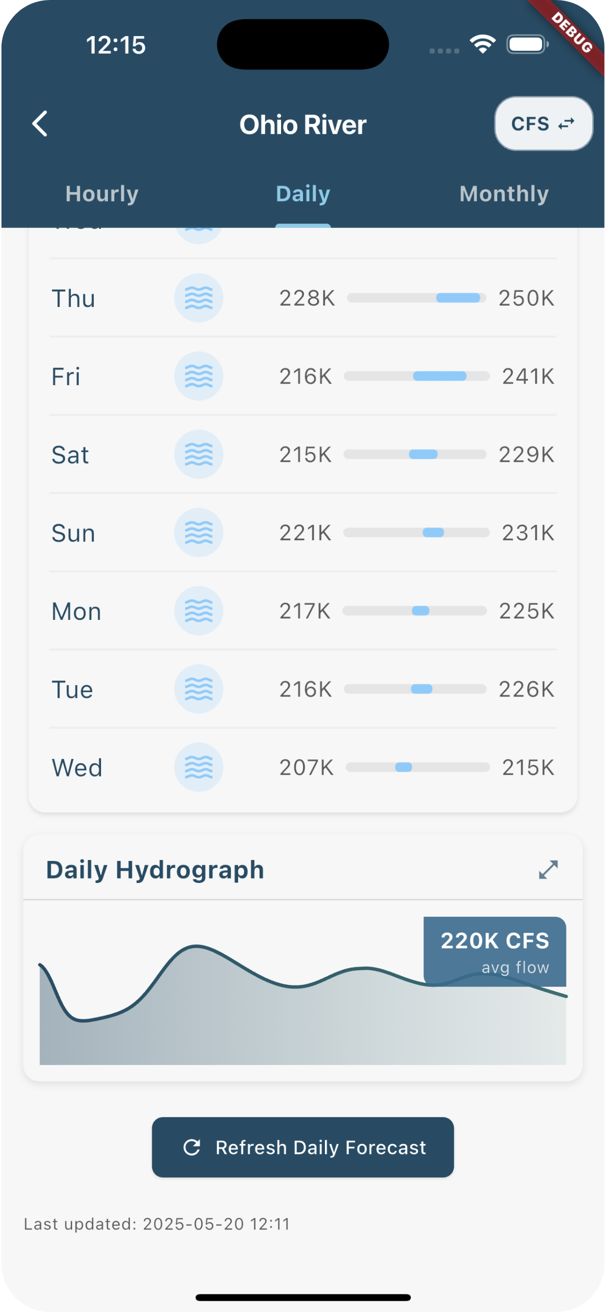 - See the daily hydrograph showing predicted flow trends over the next few days.