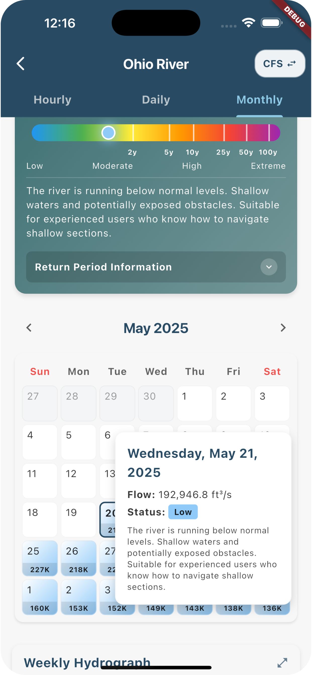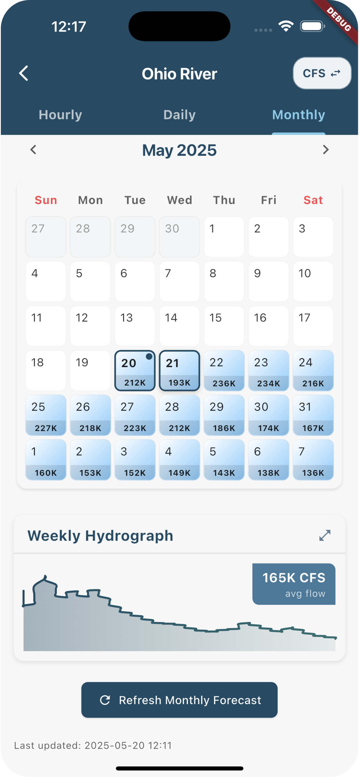 - View the monthly hydrograph depicting predicted flow trends over the month.